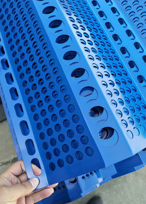 金屬防風抑塵網板材厚度0.5mm-1.5mm之間,均是由數控設備進行沖孔,成型,再進行雙面高壓靜電粉末噴涂的表面抗腐蝕處...
